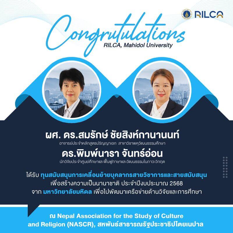 RILCA, Mahidol University congratulates Asst. Prof. Dr.Somrak Chaisingkananont Dr.Pimnara Chanorn on the successful acquisition of scholarships for the Academic and Supporting Staff Mobility Program 2025 from Mahidol University, for academic and research exchange at the Nepal Association for the Study of Culture and Religion (NASCR)