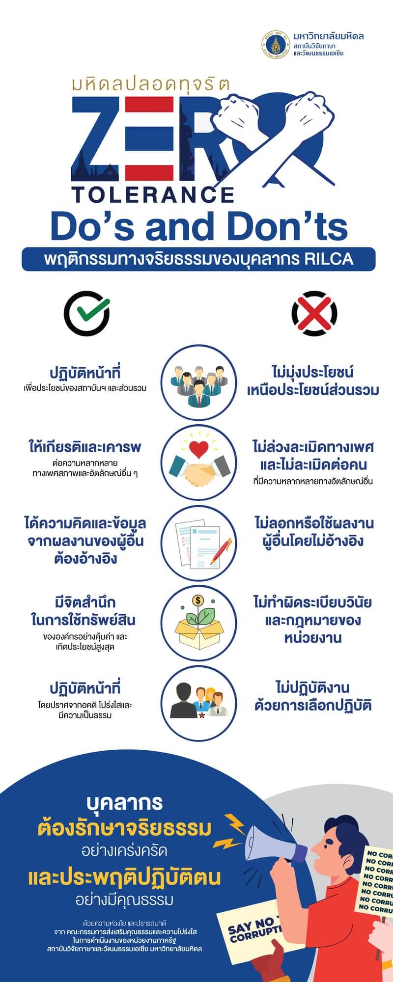 ในนามสถาบันวิจัยภาษาและวัฒนธรรมเอเชีย มหาวิทยาลัยมหิดล ดิฉันจึงขอเน้นย้ำ ให้ประชาคมชาว RILCA “ปฏิบัติหน้าที่อย่างซื่อสัตย์สุจริต เห็นประโยชน์ส่วนรวมมากกว่า ประโยชน์ส่วนตน และไม่ยอมรับการทุจริตทุกรูปแบบไม่ว่าทางตรงหรือทางอ้อม”
