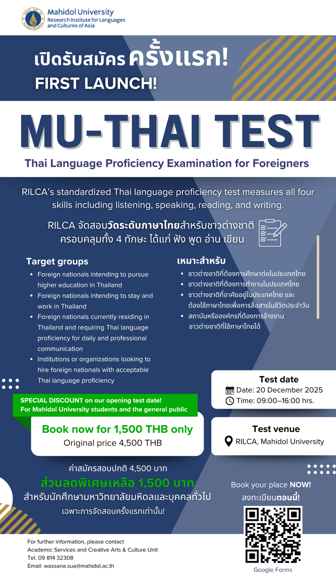 MU-Thai Test: การสอบวัดระดับภาษาไทยสำหรับชาวต่างชาติ ครอบคลุมทั้ง 4 ทักษะ ได้แก่ ฟัง พูด อ่าน เขียน
